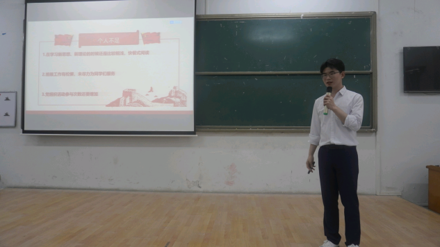 预备党员依次上台答辩。答辩人首先进行5分钟预备期情况汇报,主要从政治思想、理论学习、参加组织活动、存在不足及改进措施等方面,陈述结束后,由在场的老师、党员、积极分子提问,答辩人回答关于党史、党章、习近平新时代中国特色社会主义思想、十九届六中全会等党的理论相关问题,现场设置了评价环节,借助小程序,设优秀、良好、合格、不合格四个等级,与会人根据答辩人表现进行客观评价。