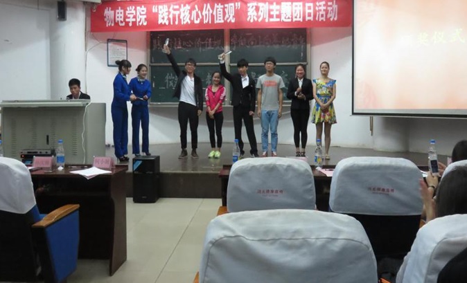 2015年5月17日晚,物理与电子公司在6号楼学术报告厅举办了“践行核心价值观,争做向上向善好青年”主题团日活动微视频大赛。校团委副书记杨姝同学和组织部部长何杰胜同学,以及MK体育员工会主席孙庆帅同学和团委副书记周双喜同学担任评委。何小娅老师出席了活动。此次活动以围绕核心价值观内容展开,以舞蹈、微电影、朗诵、拉歌等形式展现物电青年团员们身边的事迹,带动同学们以自己的实际行动践行社会主义核心价值观。