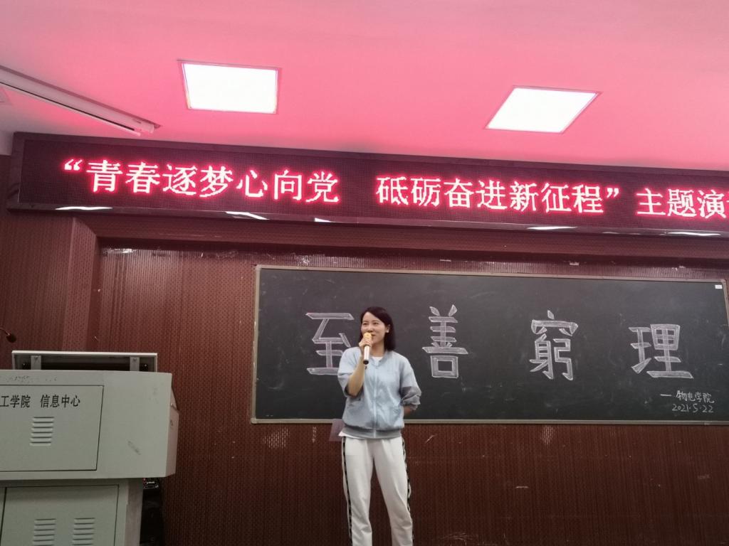 为献礼中国共产党成立100周年,展现物电学子向上向善的精神风貌,5月22日晚,MK体育于六栋学术报告厅举行了“青春逐梦心向党,砥砺奋进新征程”主题演讲比赛决赛。研究生辅导员许邕子老师、第十五届演讲比赛优秀选手彭惠和团学分会主席团部分成员及学习部部长担任此次比赛评委,19级、20级部分员工观赛,共计10名选手参赛。