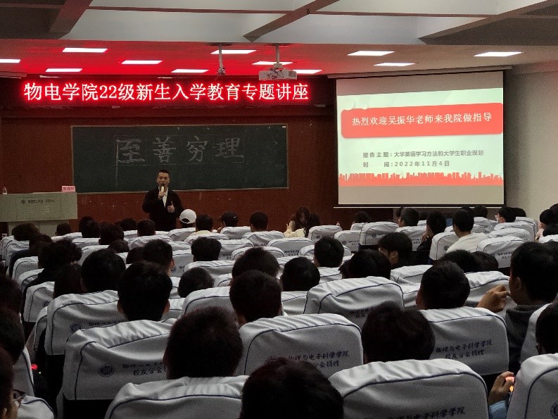 李科敏教授在做了简短的介绍之后,讲座即在轻松愉快的氛围中展开。吴老师多才多艺,精通多国语言,用不同语言进行了自我介绍,重点向同学们分享了有效的学习方法和成功案例,同时告诫同学们在大学,要怀着一颗谦卑、感恩之心,努力学好专业知识和英语,持之以恒地提高自己的综合素养,并根据自己的实际情况,切实做好自己的职业规划。