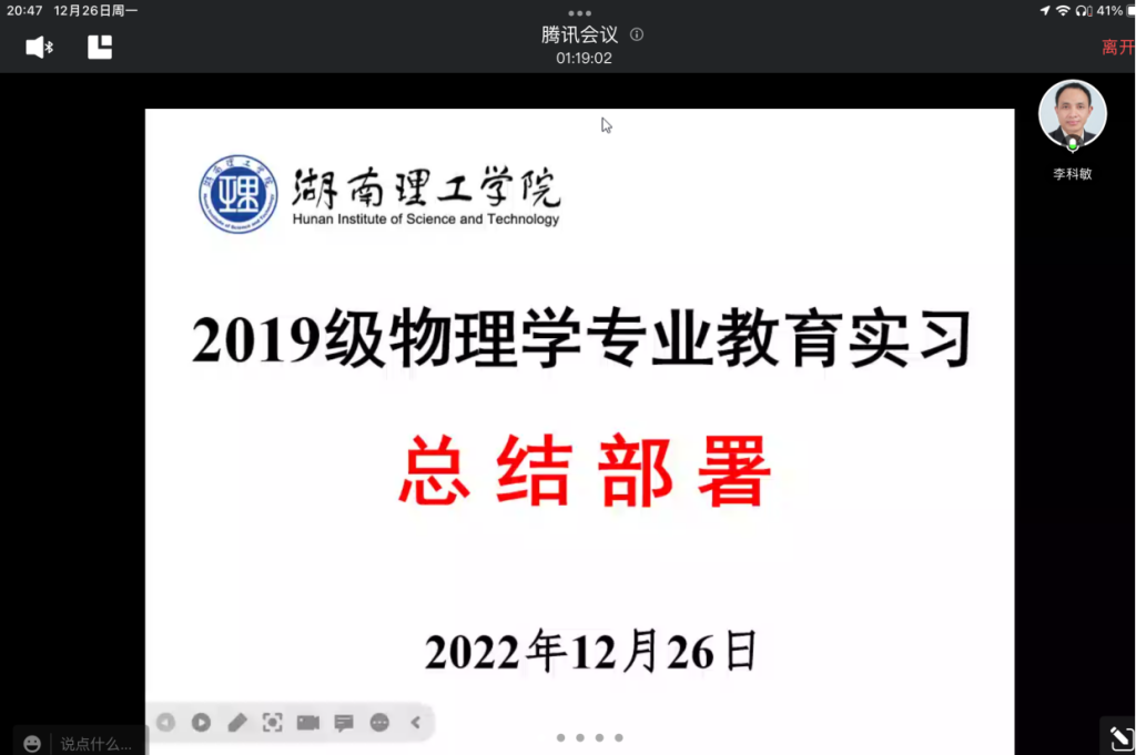 2022年12月26日,MK体育通过腾讯会议部署了“2019级物理学专业教育实习总结”工作,全体实习生和指导教师参加。公司党委副书记李科敏教授主持。