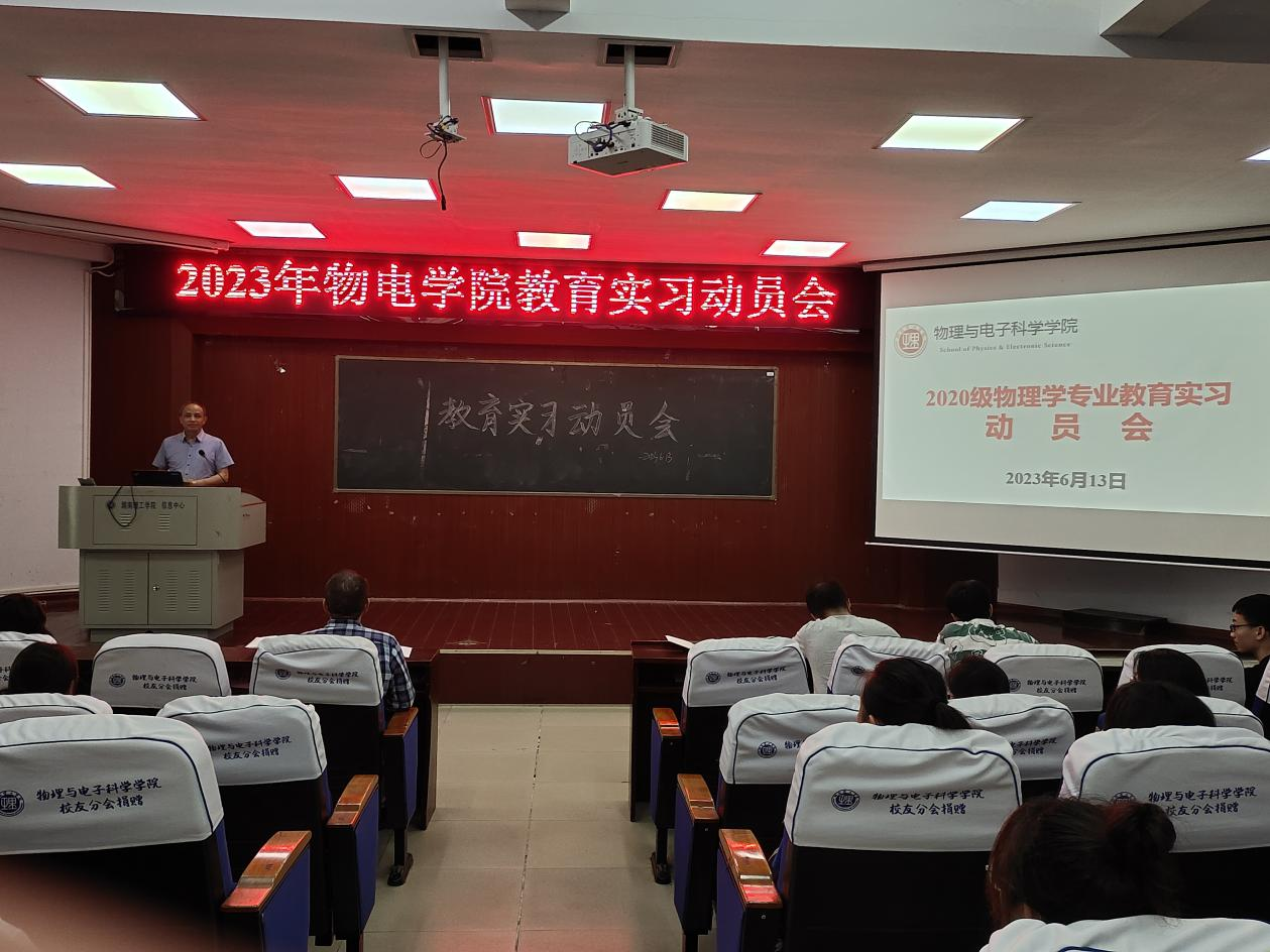 2023年6月13日下午,MK体育在物电楼学术报告厅举行2020级物理学师范生教育实习动员大会,公司党委书记周畅、副书记李科敏、副经理魏勇、班主任李奇云、稂林,以及全体本年级本专业员工参加。