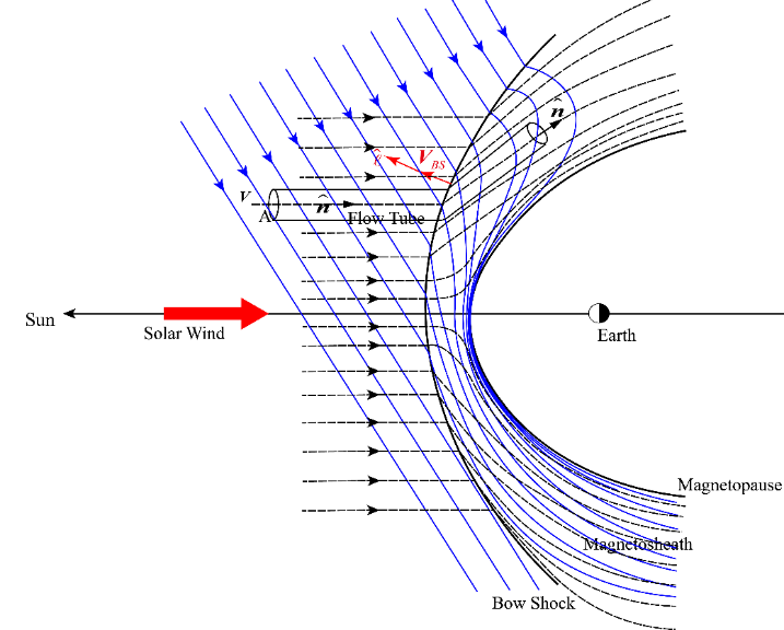 伯努利定理(或伯努利方程)是流体和等离子体动力学中的一般性原理,阐明了稳定、可压缩或不可压缩的粘性流体或等离子体沿流线的能量守恒(以各种形式表示)。弓激波是流体和等离子体中的常见现象,了解弓激波上游和下游之间的物理关系至关重要。在空间等离子体中,弓激波附近两侧不连续的流体参数通常由众所周知的 Rankine-Hugoniot (R-H) 跃变条件来描述,该条件源自磁流体动力学 (MHD) 方程。质量、动量和能量守恒定律产生了 R-H条件,该条件描述了弓激波两侧等离子体的热力学变量、速度和磁场的跃变。R-H 条件已被广泛用于研究太阳风中的不连续性。与 R-H 跃变条件相比,广义的伯努利方程为地球弓激波两侧的太阳风提供了更简单的能量守恒公式,使其更适合研究从太阳风到磁层的能量传输。只要等离子体流是稳定的,伯努利方程就适用于整条流线。