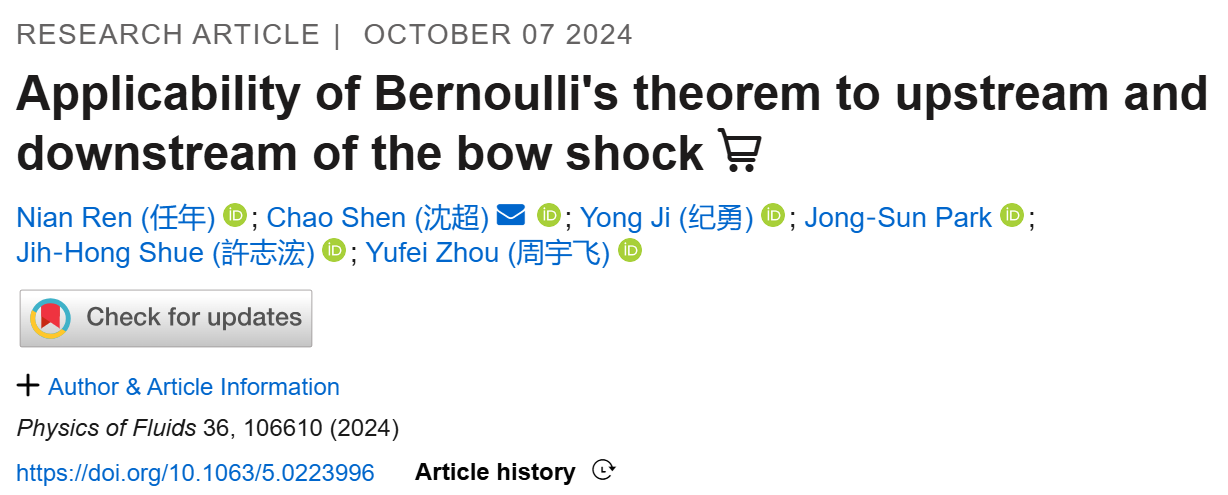 10月7日,公司任年博士在国际学术期刊《Physics of Fluids》(AIP美国物理学会出版)发表题为“伯努利定理对弓激波上下游的适用性”(Applicability of Bernoulli's theorem to upstream and downstream of the bow shock)的研究论文,该论文被中科院二区(JCR一区)收录。