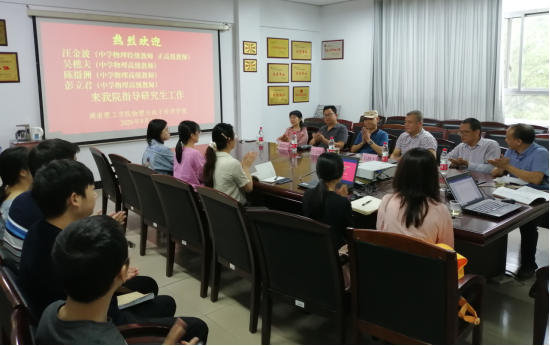 随后,校外导师吴樵夫(岳阳市第一中学副董事长、中学物理高级教师)回顾了自己的成长经历,认为研究生要苦练基本功,认真做中学物理题;虚心向他人请教,多听师傅的课,多听骨干教师的课;要耐得住寂寞,潜心研究教材、研究员工、研究课题;要认真做好班主任,要有原则,要有威信,要注意方法。最后,吴董事长结合近年来岳阳市一中招聘教师的要求,勉励我们的研究生要抓紧时间发展好自己,要把心思花在教学上,把教师职业当做事业来经营,立志做好一名教师,当别人看得起的教师。