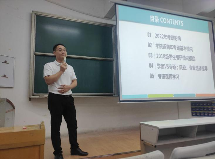 首先,分管副经理邹志军为同学们做了主题为“知识改变命运,考研绽放自我”的考研指导。结合PPT,邹志军向大家分别介绍了考研时间、近四年考研基本情况、学硕与专硕的区别等内容,着重强调了院校和专业选择,希望同学们坚定信念,实现目标。