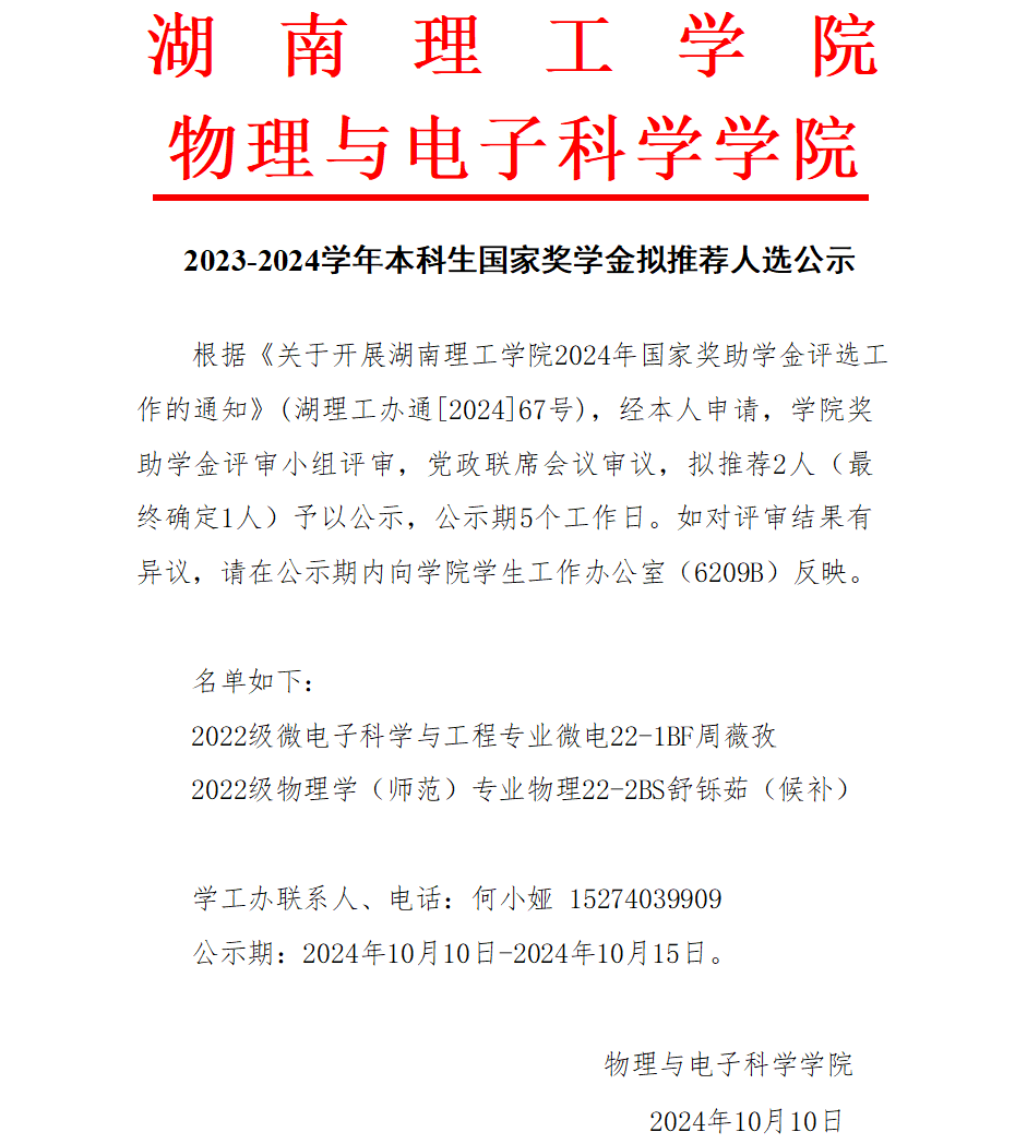 2023-2024学年本科生国家奖学金拟推荐人选公示