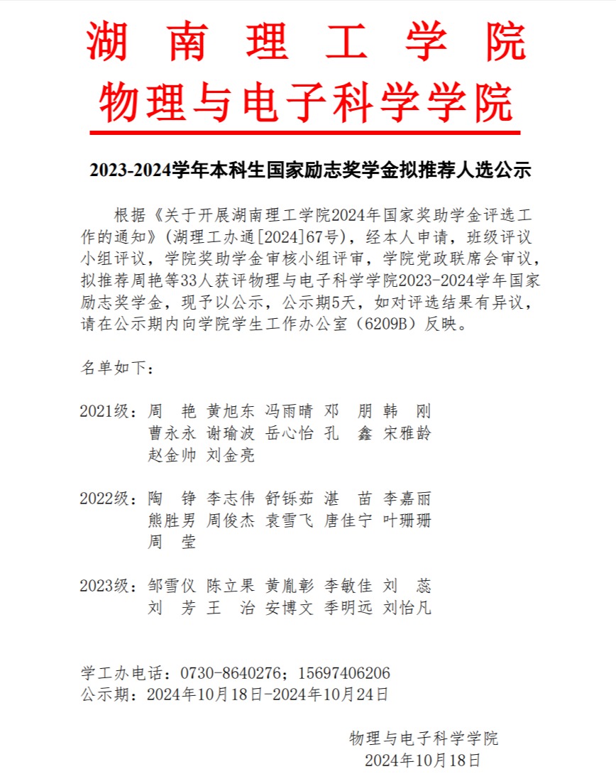 2023-2024学年本科生国家励志奖学金拟推荐人选公示